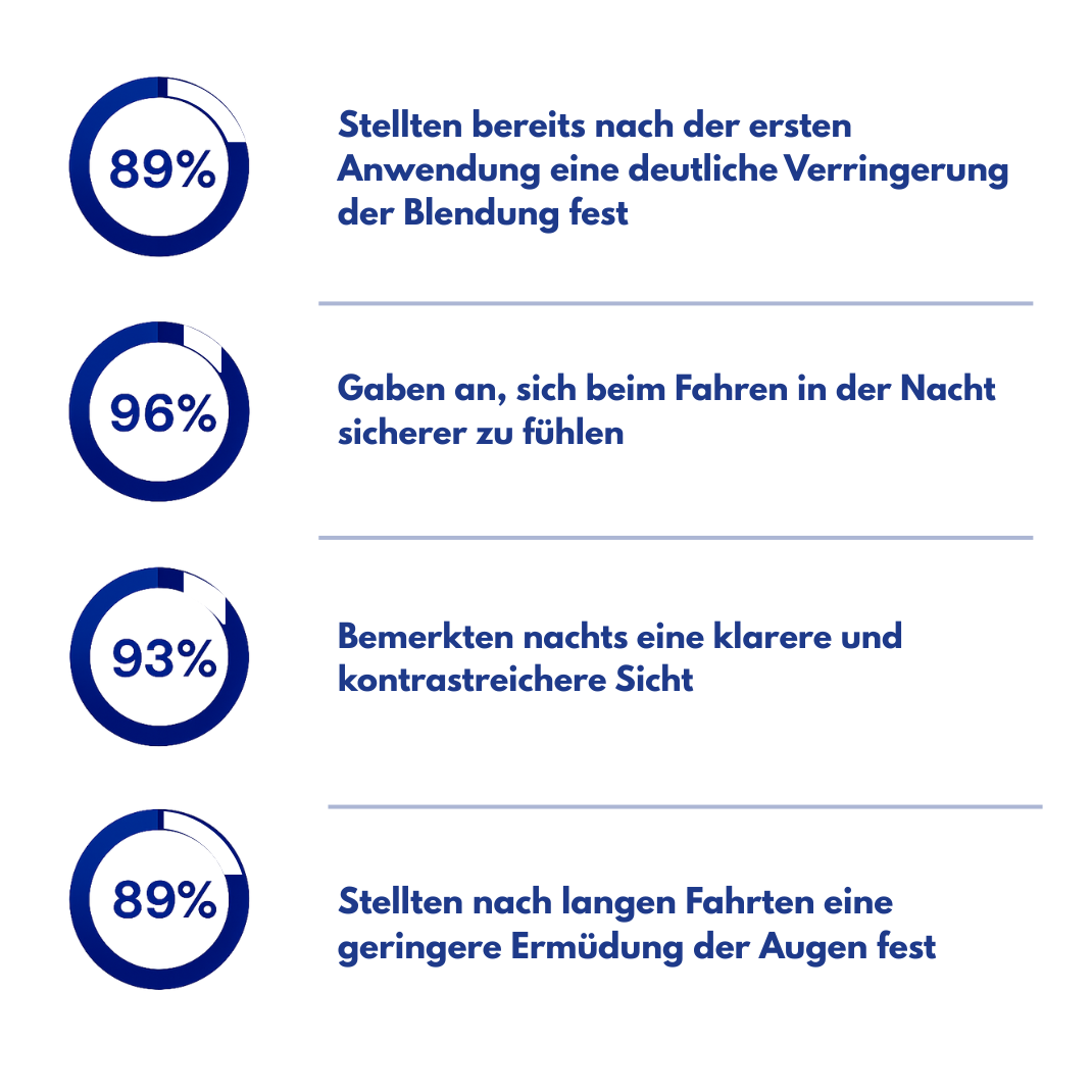 Tests haben gezeigt, dass die Blendung deutlich verringert wird und die Nachtsicht schon bei den ersten Anwendungen spürbar besser wird.