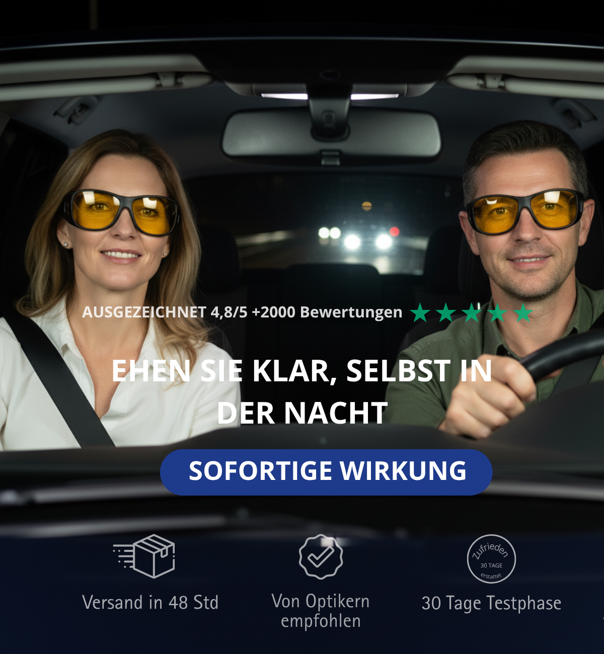 Nein, diese Brillen verdunkeln sich nachts nicht. Die orangefarbenen Gläser reduzieren die Blendung, ohne Ihre Sicht auf der Straße zu beeinträchtigen. Sie können also stets klar und sicher sehen, selbst wenn störendes Licht von Scheinwerfern oder LEDs Sie irritiert.